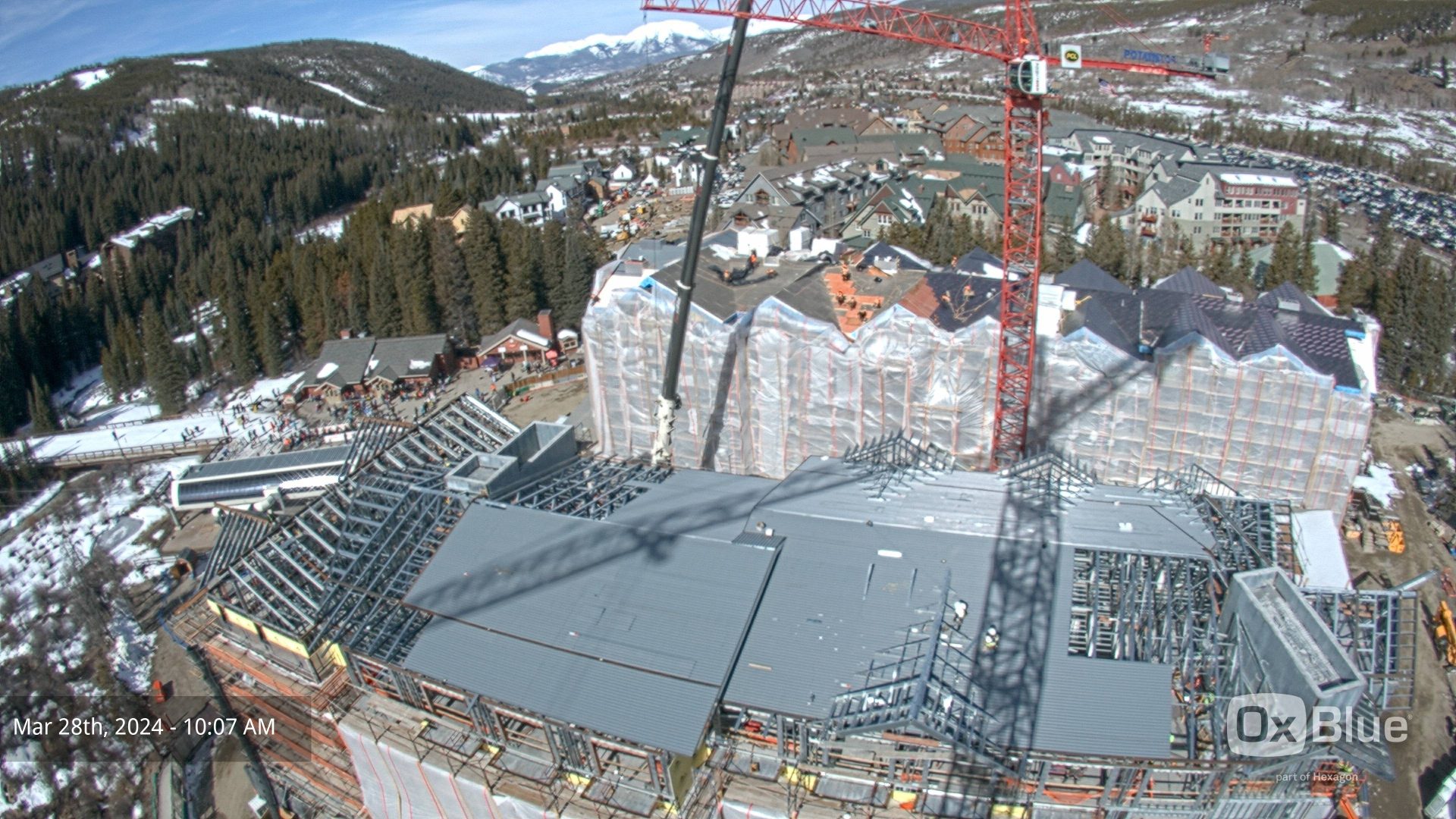 As the ski season comes to a close at Keystone (closing day is April 7), the PCL Construction crew is ramping up its work to complete the exterior structure of the West Tower and its 66 luxury residences. The West Tower’s structure is almost finished, and the tower is expected to be “dried in” by next week. In anticipation, the West Tower crane was removed on Thursday, March 28, marking a key milestone in the project.