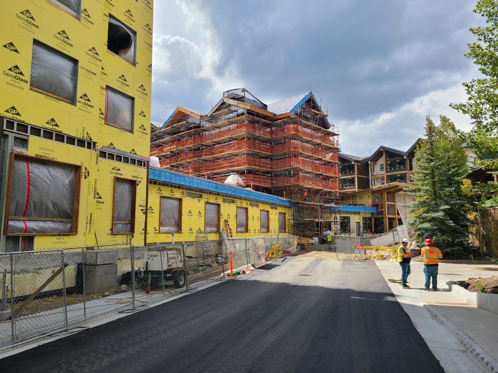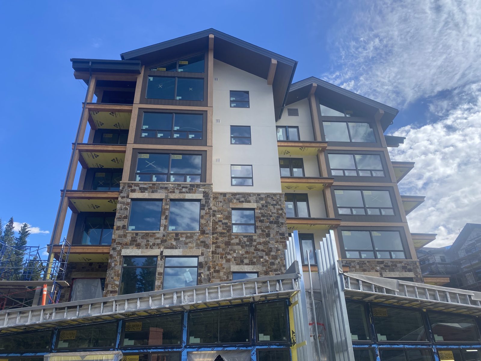 Now, that the leaves are changing, the construction crew has removed the scaffolding on the West Tower, revealing the exterior of the building and the gorgeous stonework and large windows of the luxury residences. The team is starting to remove the scaffolding for the Hotel Tower (the center tower). And, has wrapped the East Tower in plastic to insulate it for the winter building season.